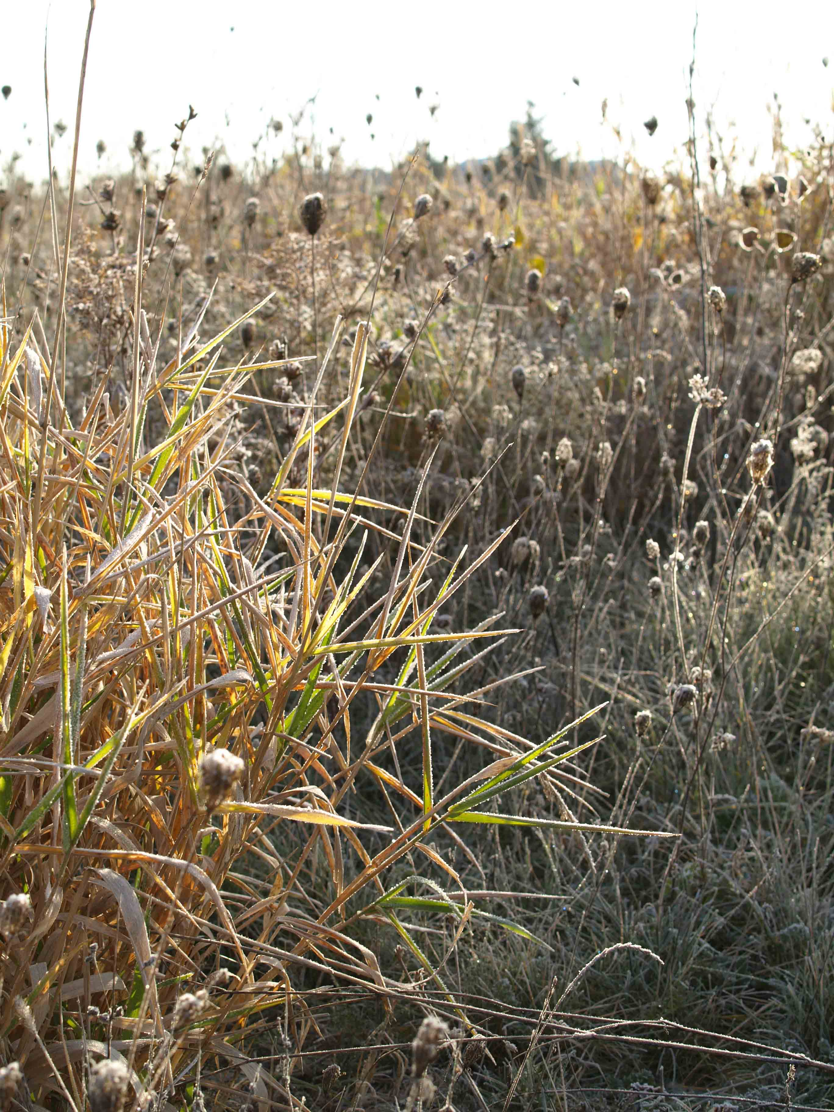 Frost-tinged grasses in the morning sunlight