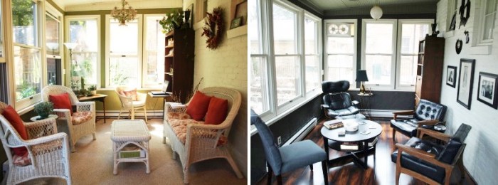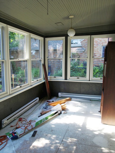 I’ve a feeling a great many people (especially women perhaps) might be of the opinion that these pictures surely must be backwards. But no, and in fact transforming the very feminine sun room into the very masculine cigar room was my idea, not my husband’s. The result is that we both spend a lot of time in this room now where before he almost never did. Those wicker chairs were not terribly comfortable. And now he has a place to smoke cigars all year long without being exiled to the freezing or mosquito-y outdoors. We spend a good deal of time writing out here, as well as entertaining friends while children roam the rest of the house unsupervised. It’s great. We finished more of the work by the summer of 2016. To see more of this room, click here.